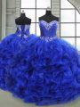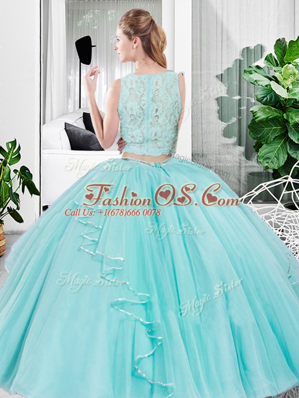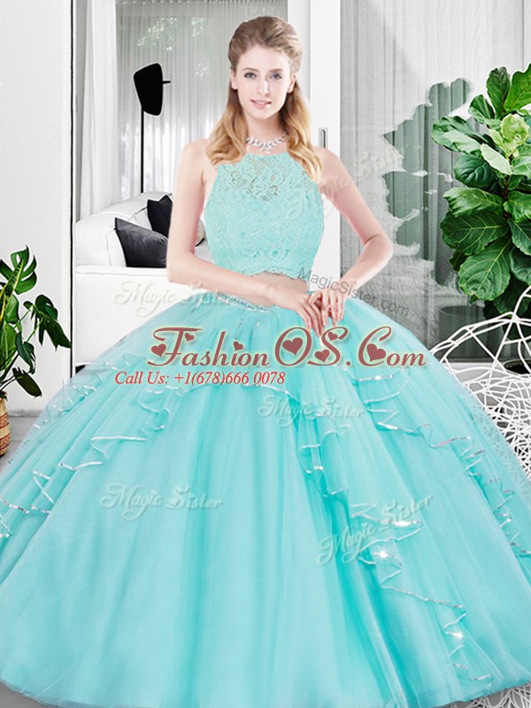 Aqua Blue Tulle Zipper Ball Gown Prom Dress Sleeveless Floor Length Lace and Ruffled Layers