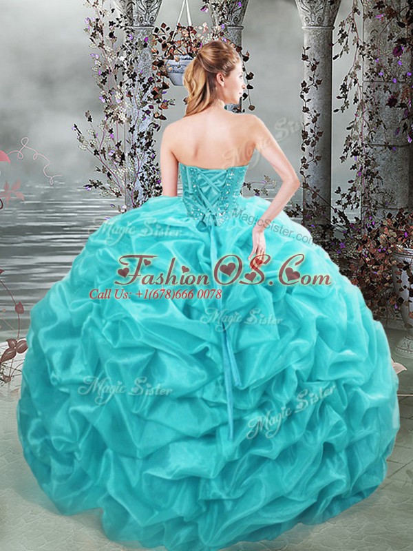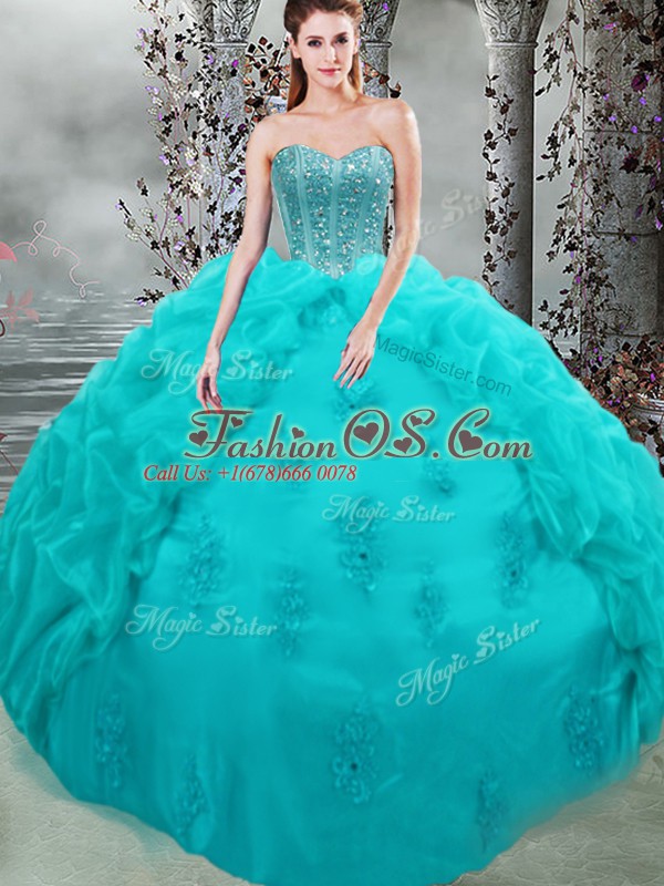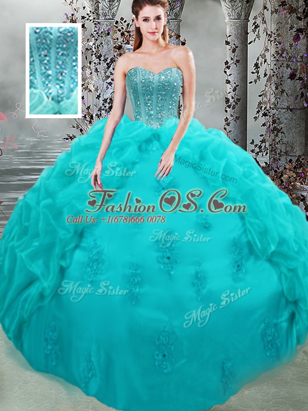 New Style Floor Length Lace Up Quinceanera Gown Aqua Blue for Military Ball and Sweet 16 and Quinceanera with Beading and Appliques and Pick Ups