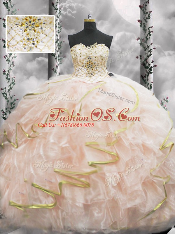 Customized Sweetheart Sleeveless Quinceanera Dresses Brush Train Beading and Ruffles Peach Organza