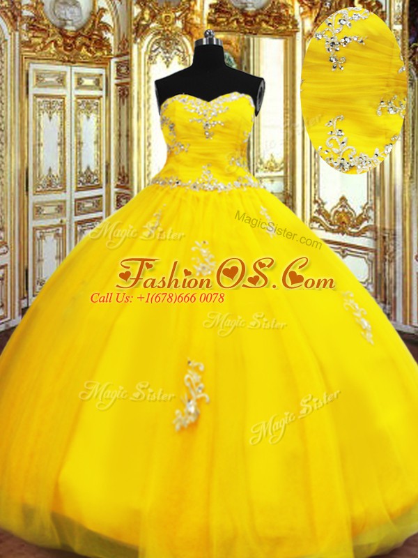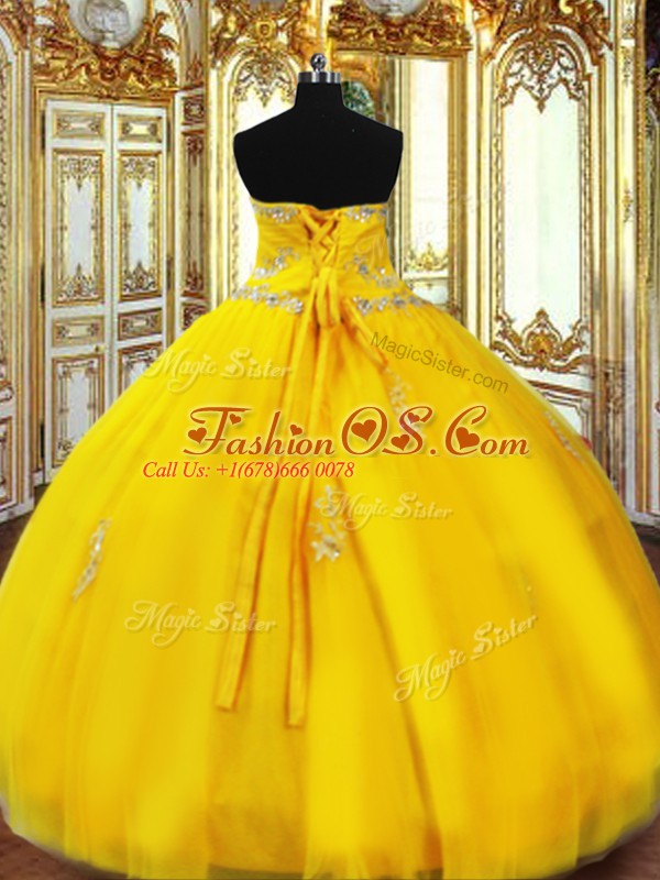 Elegant Floor Length Lace Up Quinceanera Dress Gold for Military Ball and Sweet 16 and Quinceanera with Beading and Appliques