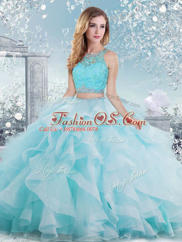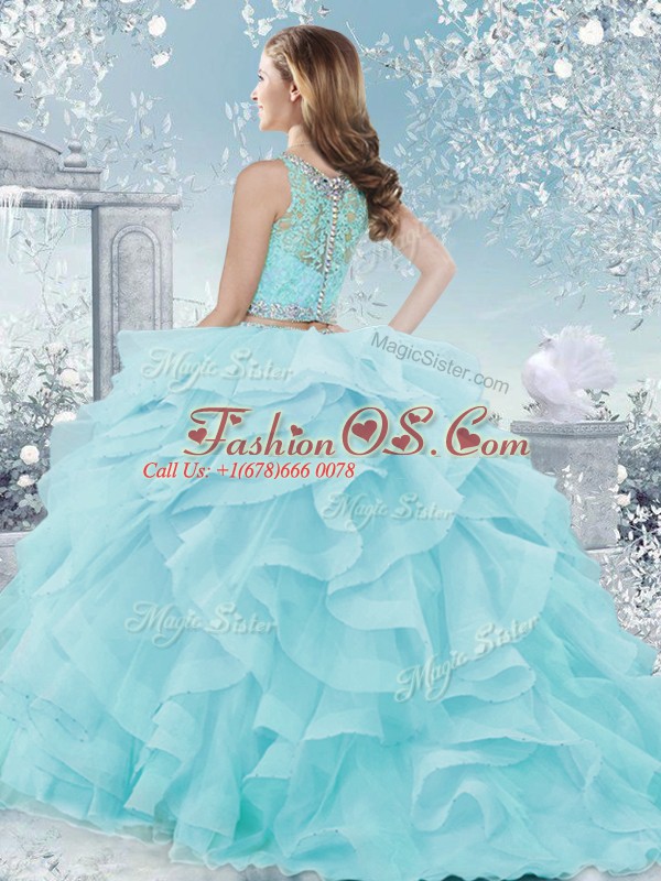 Customized Aqua Blue Ball Gowns Beading and Ruffles Ball Gown Prom Dress Clasp Handle Organza Sleeveless Floor Length