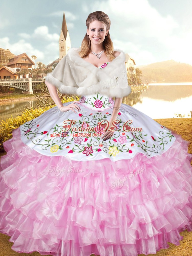 Rose Pink Sleeveless Floor Length Embroidery and Ruffled Layers Lace Up Quince Ball Gowns