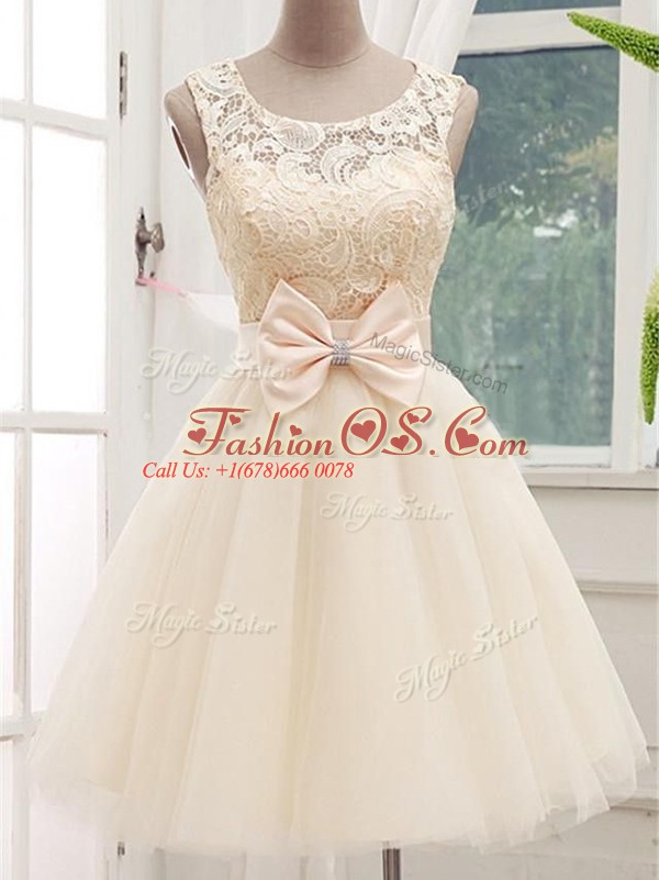 Tulle Scoop Sleeveless Lace Up Lace and Bowknot Bridesmaids Dress in Champagne
