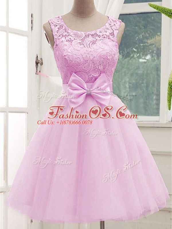 Perfect Knee Length Lilac Bridesmaid Dresses Tulle Sleeveless Lace and Bowknot