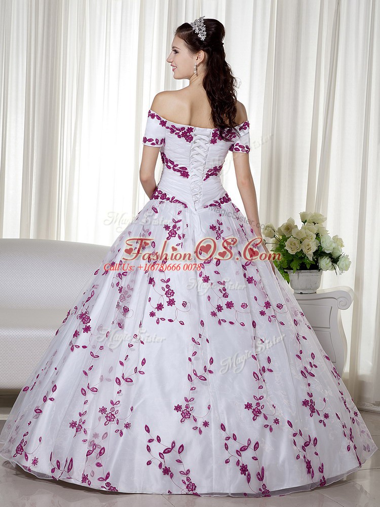 Free and Easy White Ball Gowns Embroidery Quinceanera Dresses Lace Up Organza Short Sleeves Floor Length