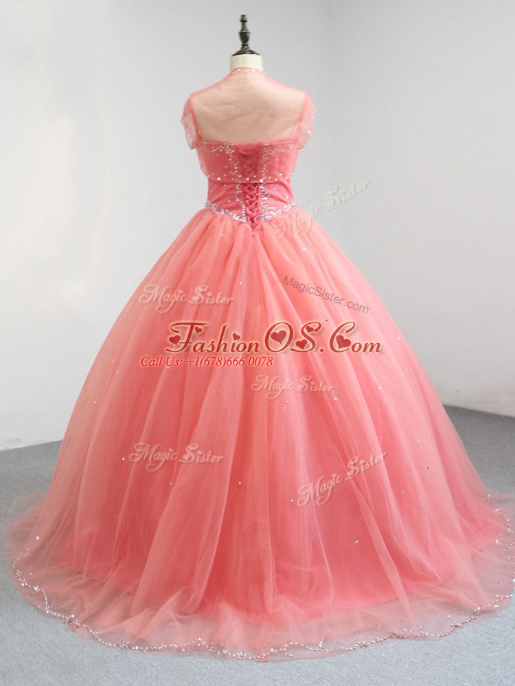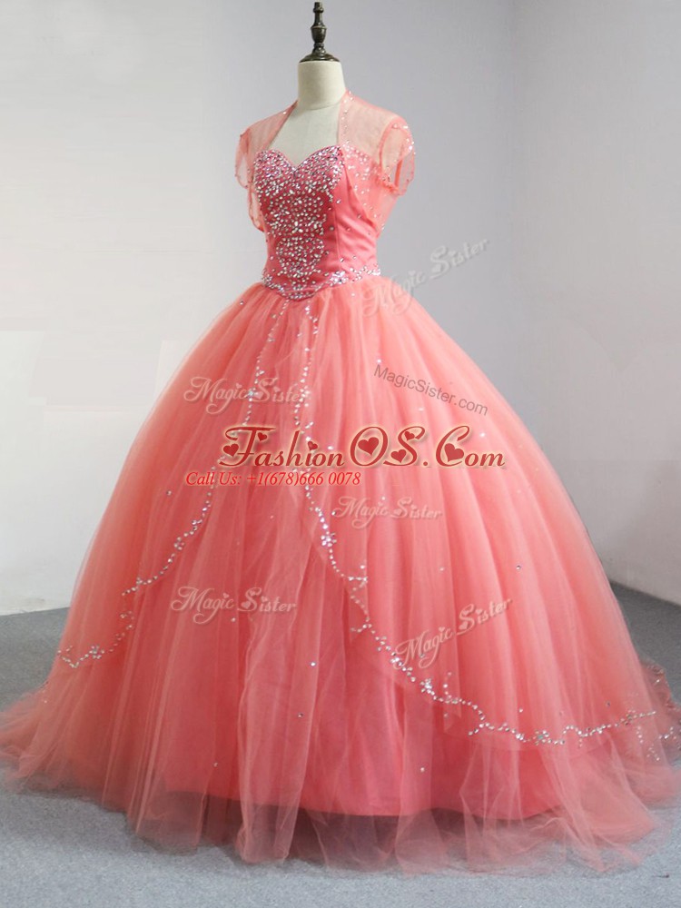 Simple Watermelon Red V-neck Lace Up Beading Quince Ball Gowns Sleeveless