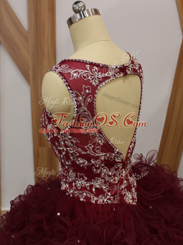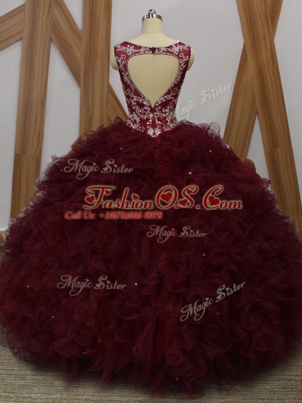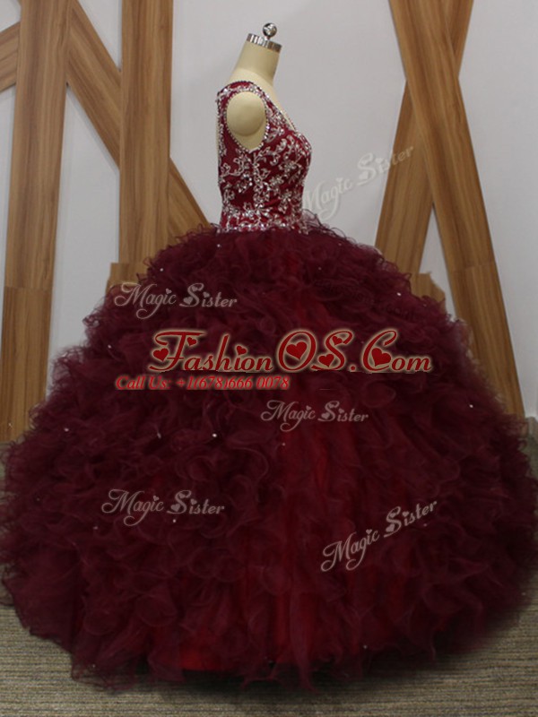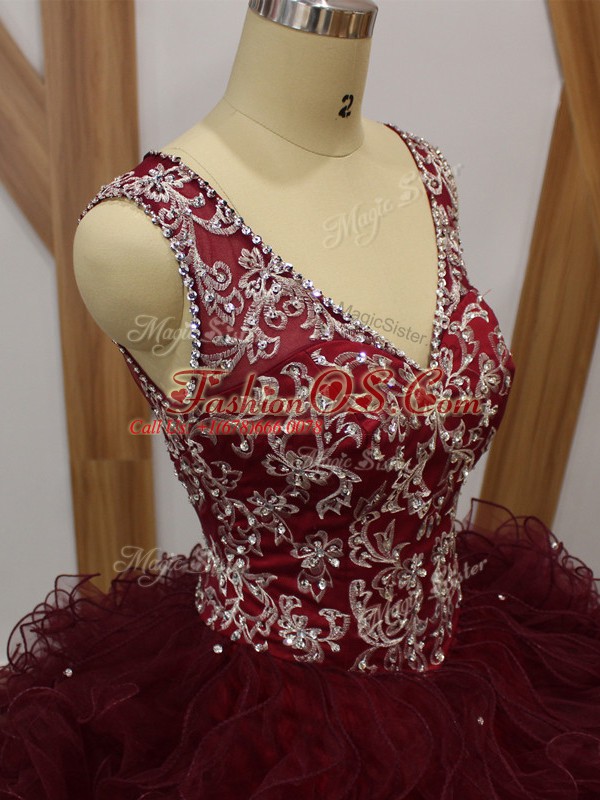Ball Gowns Quinceanera Dresses Burgundy V-neck Organza Sleeveless Floor Length Backless