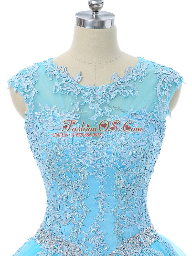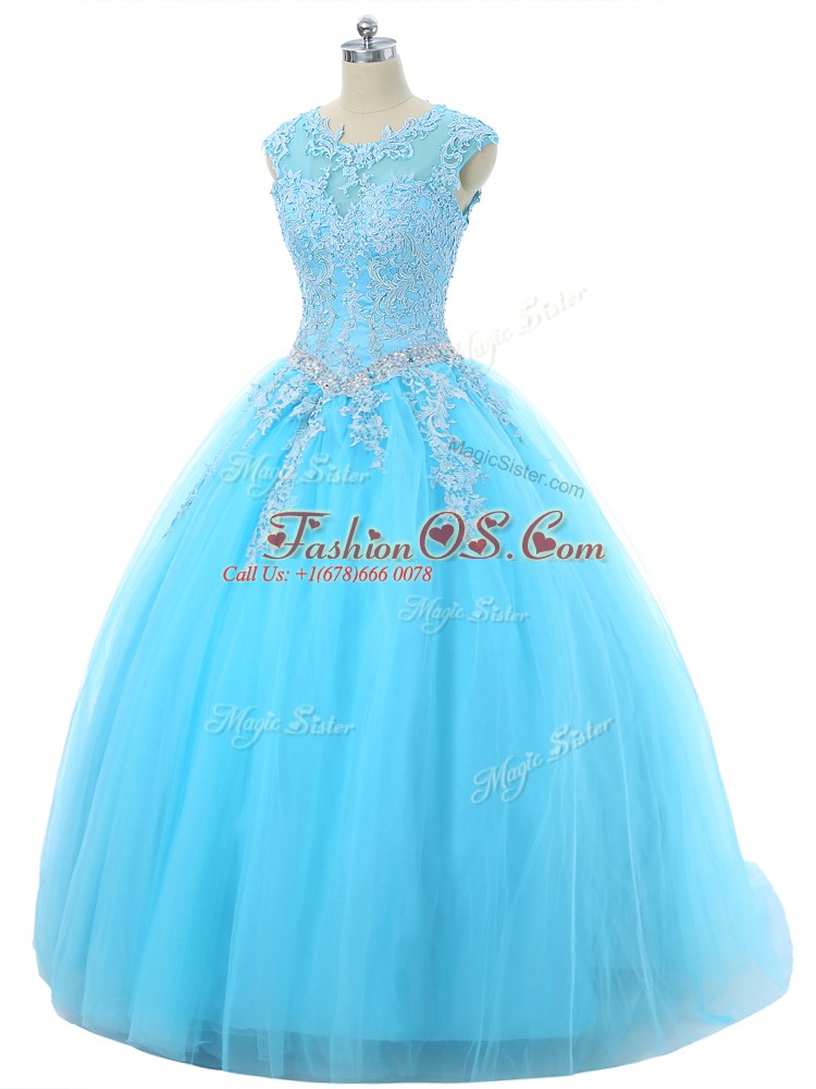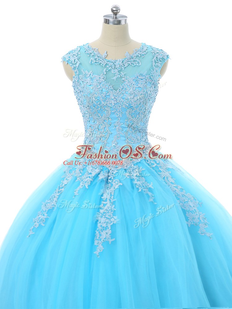 Edgy Scoop Sleeveless Vestidos de Quinceanera Floor Length Appliques Aqua Blue Tulle