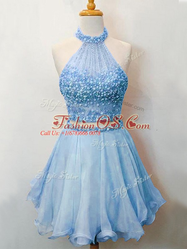 Luxury Blue Bridesmaid Gown Prom and Party and Wedding Party with Beading Halter Top Sleeveless Lace Up