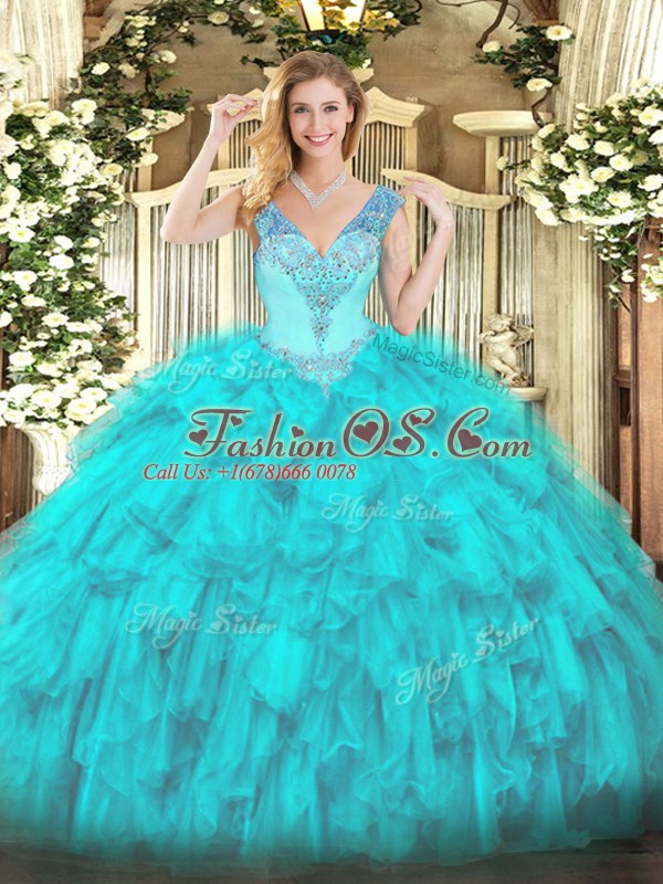 Glittering V-neck Sleeveless Quinceanera Dress Floor Length Beading and Ruffles Aqua Blue Organza