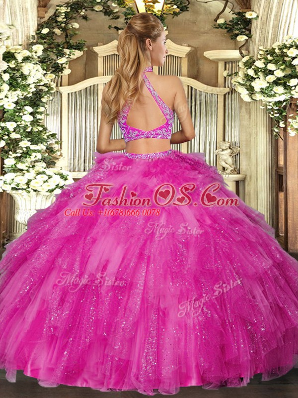 Wonderful Floor Length Two Pieces Sleeveless Fuchsia 15th Birthday Dress Criss Cross