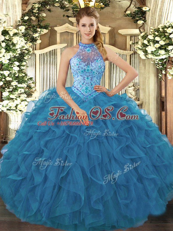 Fine Teal Quince Ball Gowns Sweet 16 and Quinceanera with Embroidery and Ruffles Halter Top Sleeveless Lace Up