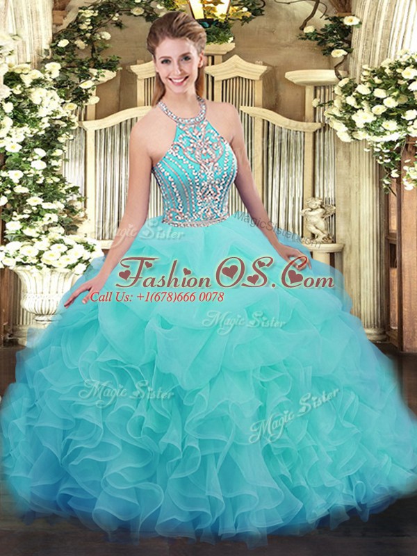 Aqua Blue Sleeveless Tulle Lace Up Sweet 16 Dresses for Military Ball and Sweet 16 and Quinceanera