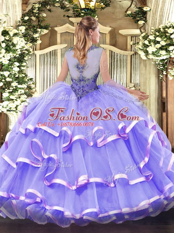Classical Sleeveless Organza Floor Length Zipper Ball Gown Prom Dress in Peach with Beading and Ruffled Layers