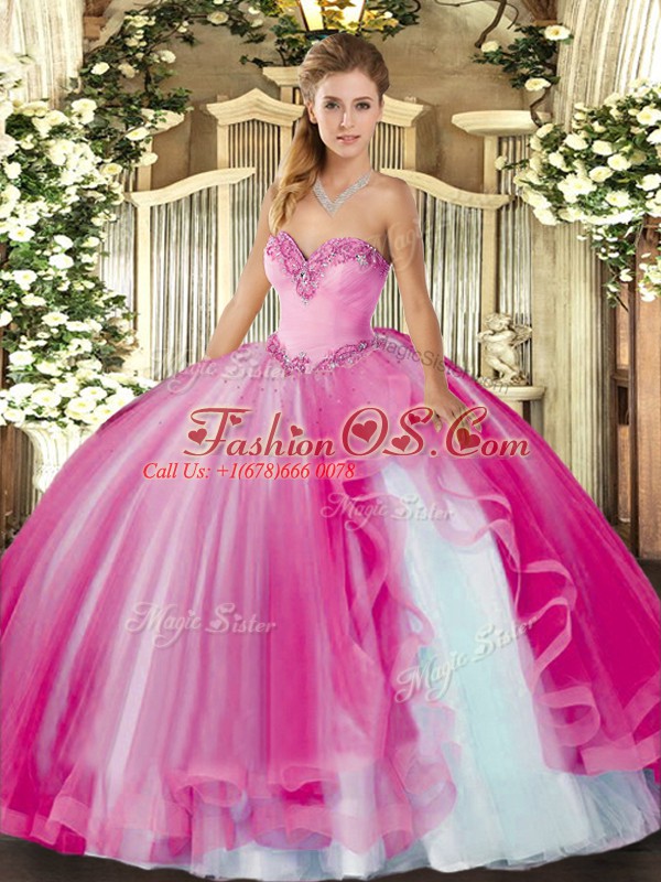 Luxurious Fuchsia Ball Gowns Beading and Ruffles Quinceanera Gown Lace Up Tulle Sleeveless Floor Length
