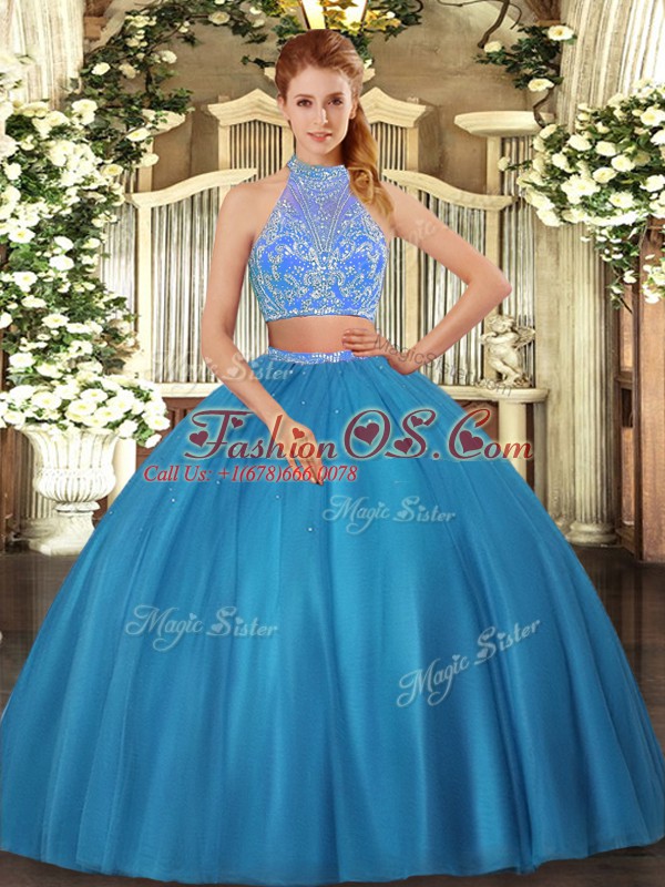 High Quality Teal Two Pieces Tulle Halter Top Sleeveless Beading Floor Length Criss Cross Sweet 16 Dresses