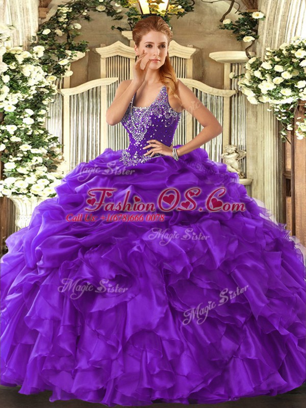 Purple Organza Lace Up Straps Sleeveless Floor Length Sweet 16 Dresses Beading and Ruffles and Pick Ups