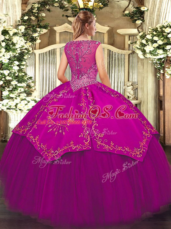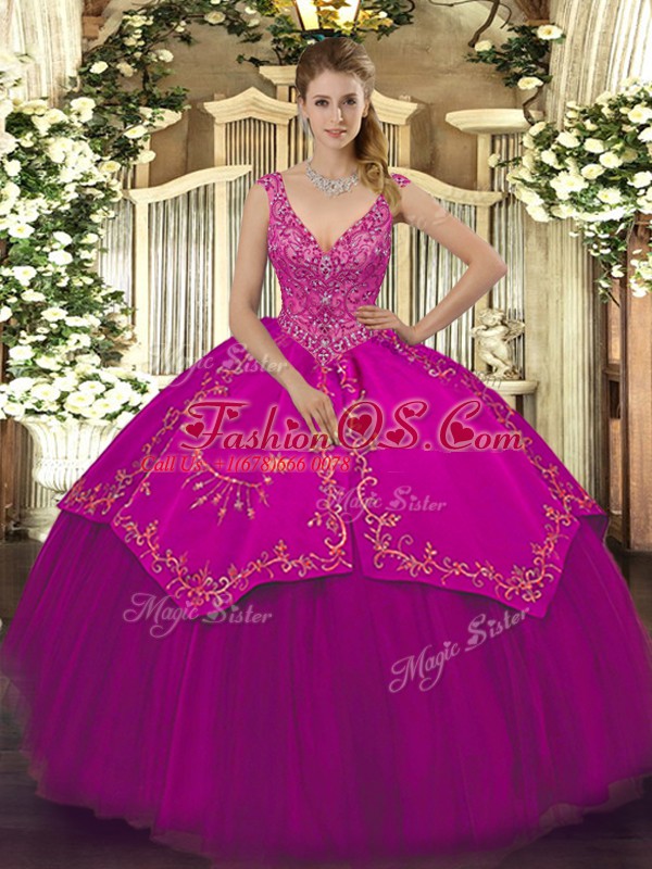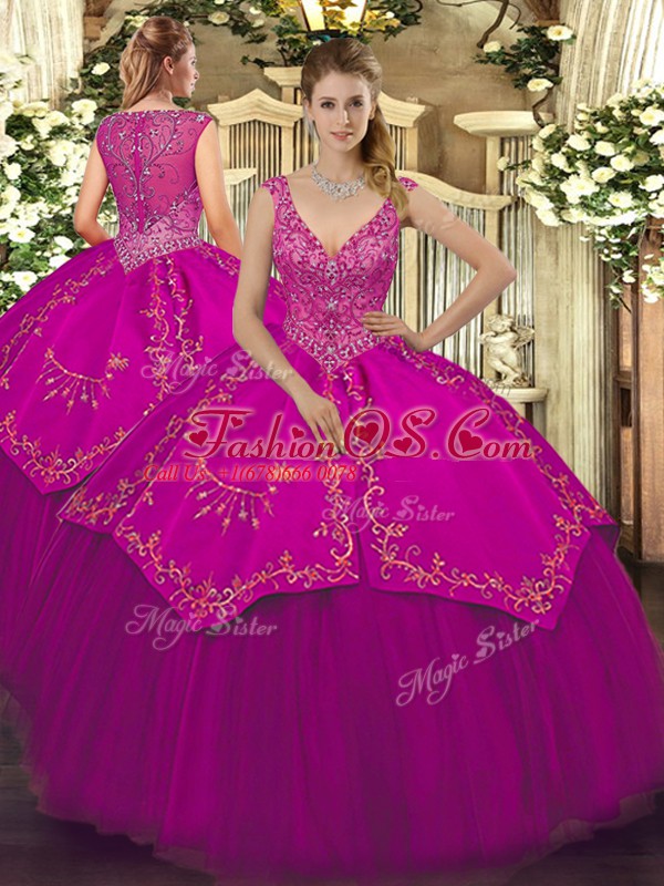 Modern V-neck Sleeveless Quinceanera Gowns Floor Length Beading and Embroidery Fuchsia Taffeta and Tulle