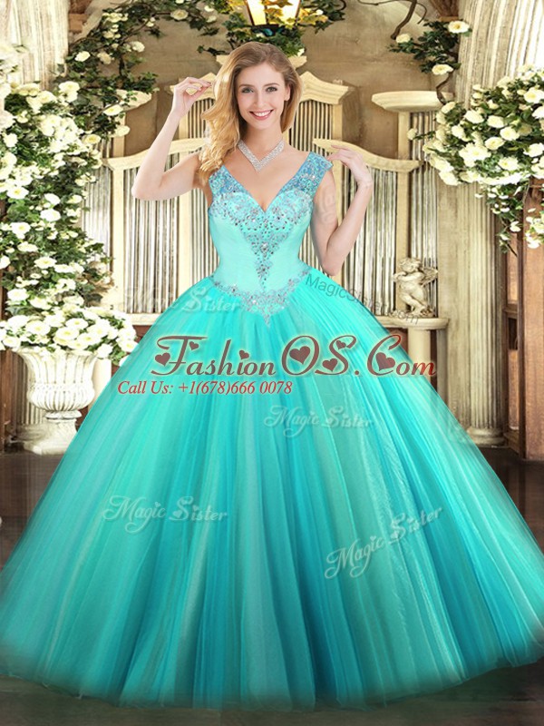 Floor Length Aqua Blue Sweet 16 Dress Tulle Sleeveless Beading