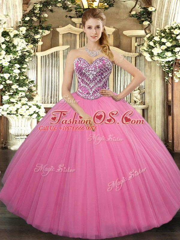 Floor Length Rose Pink Quinceanera Dresses Tulle Sleeveless Beading