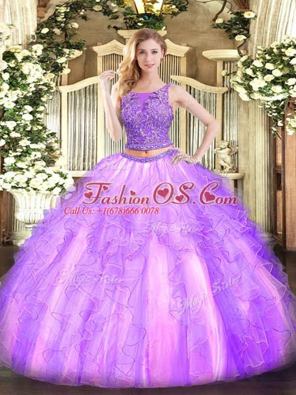 Chic Lavender Sleeveless Beading and Ruffles Floor Length Quince Ball Gowns