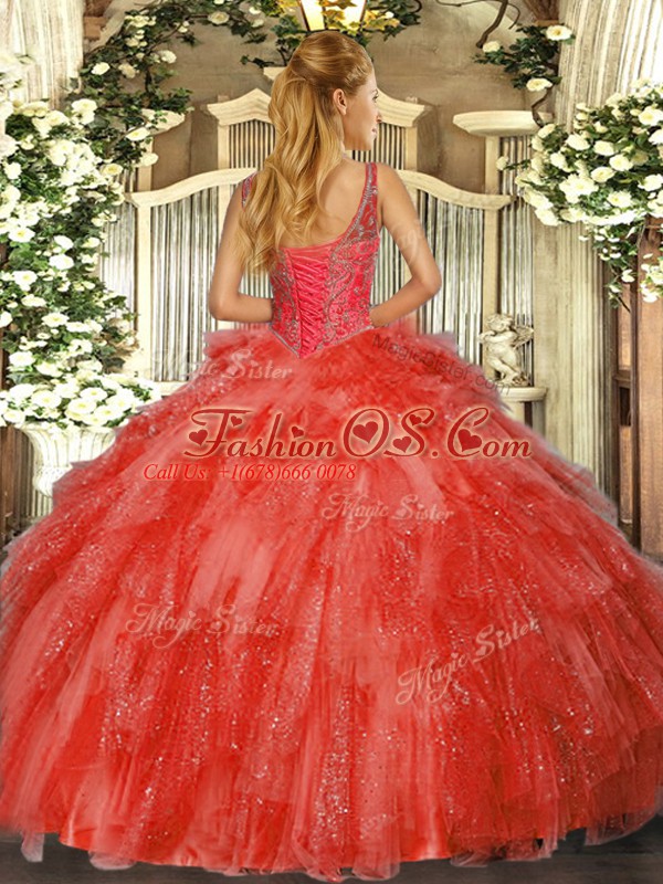 Hot Pink Lace Up V-neck Beading and Ruffles 15th Birthday Dress Tulle Sleeveless