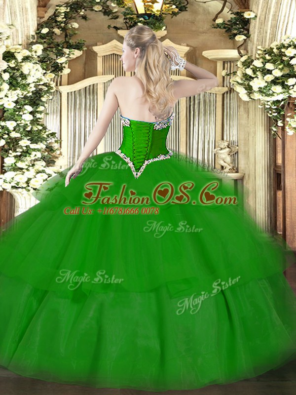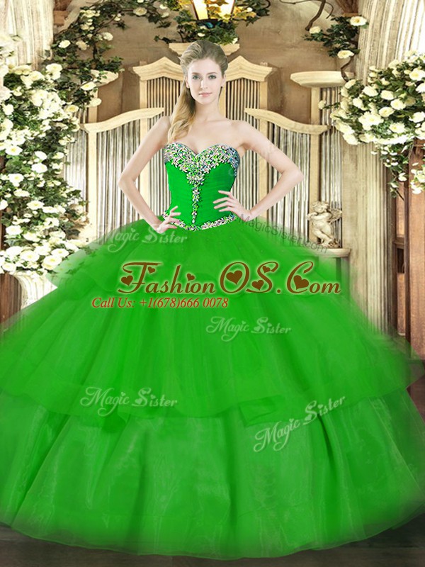 Cheap Sleeveless Tulle Floor Length Lace Up Ball Gown Prom Dress in Green with Beading and Ruffled Layers