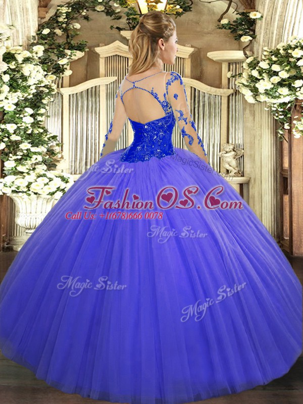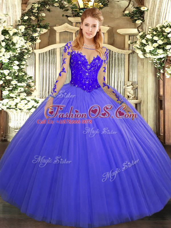 Dynamic Tulle Scoop Long Sleeves Lace Up Lace Ball Gown Prom Dress in Blue