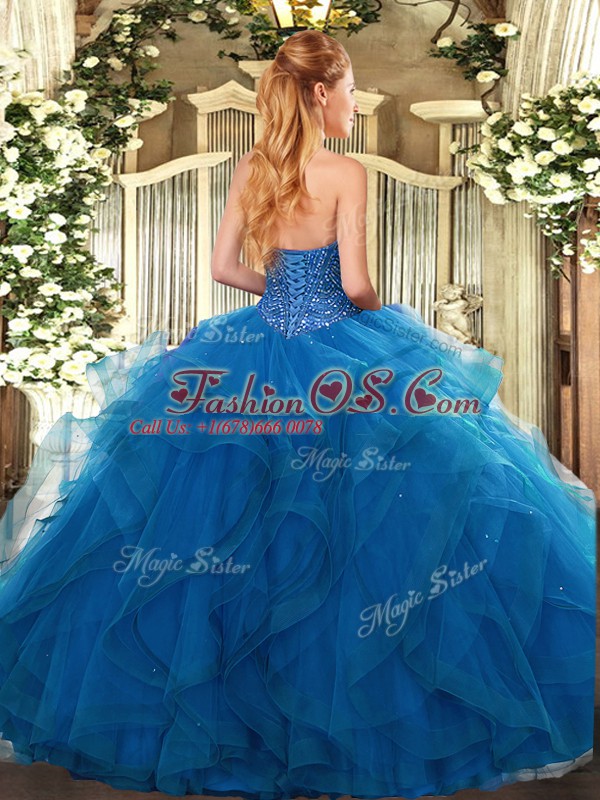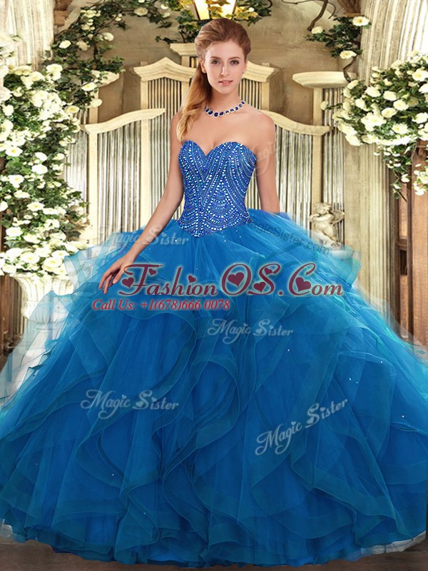 Blue Ball Gowns Tulle Sweetheart Sleeveless Beading and Ruffles Floor Length Lace Up 15 Quinceanera Dress