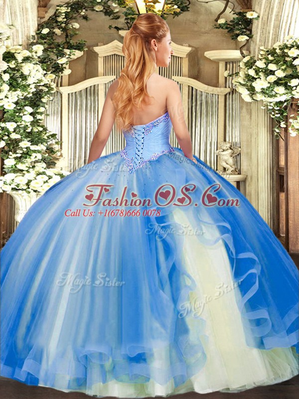 New Style Strapless Sleeveless Tulle 15th Birthday Dress Appliques and Ruffles Lace Up