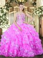 Turquoise Two Pieces Organza Scoop Sleeveless Beading and Ruffles Floor Length Lace Up Ball Gown Prom Dress
