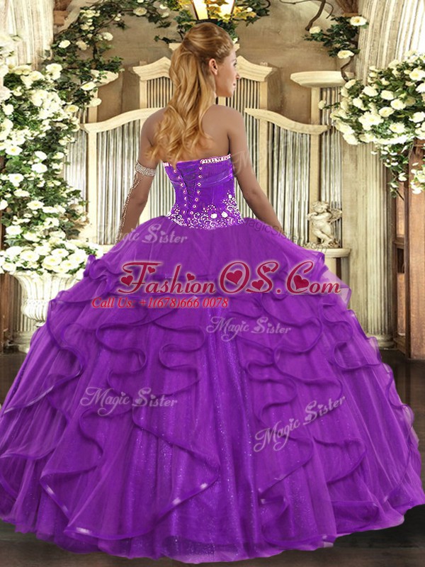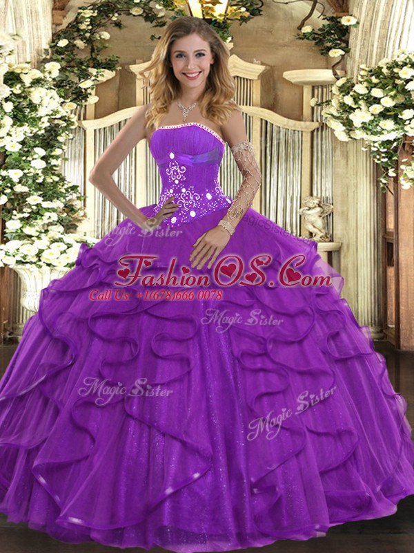 Glittering Strapless Sleeveless Tulle 15 Quinceanera Dress Beading and Ruffles Lace Up