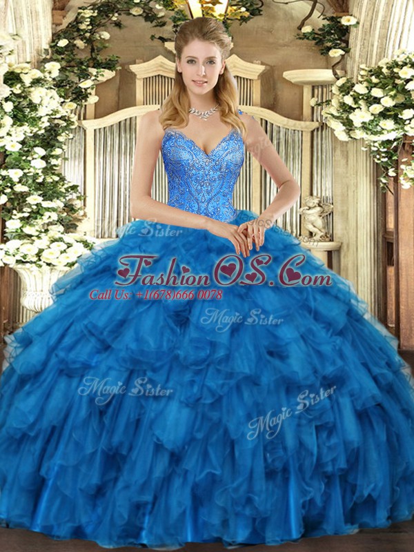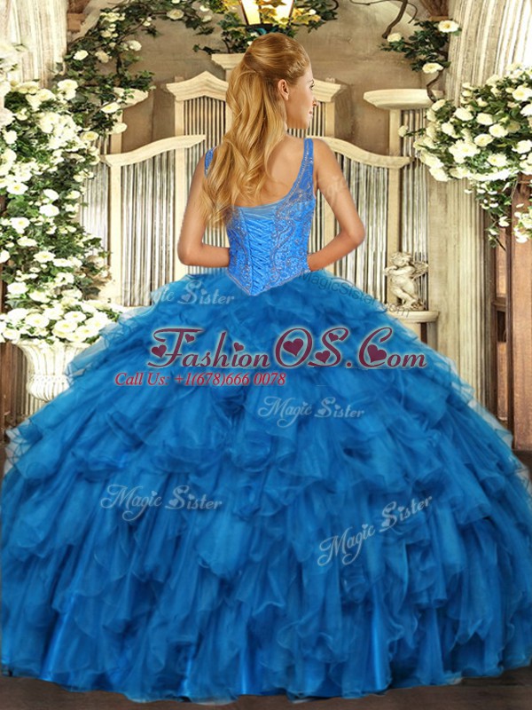 Dazzling Blue Lace Up Quinceanera Gowns Beading and Ruffles Sleeveless Floor Length