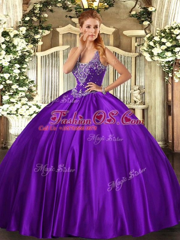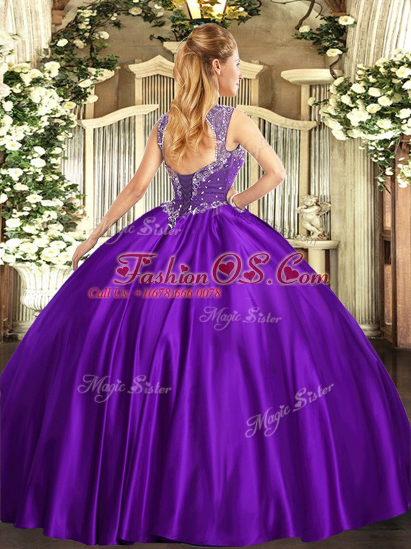 Low Price Floor Length Lace Up Quinceanera Gown Purple for Military Ball and Sweet 16 and Quinceanera with Beading