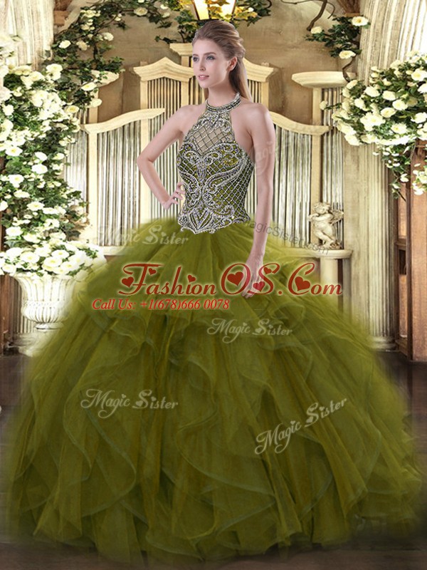 Sleeveless Floor Length Beading Lace Up Sweet 16 Dresses with Olive Green