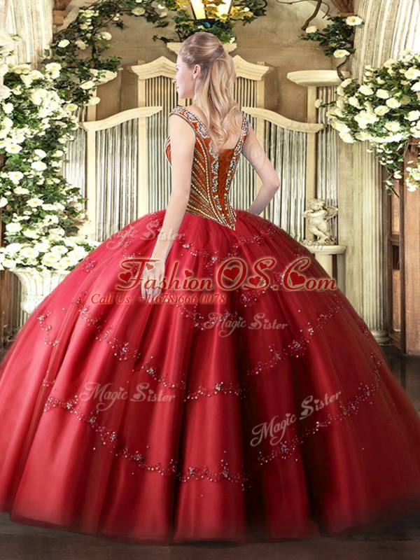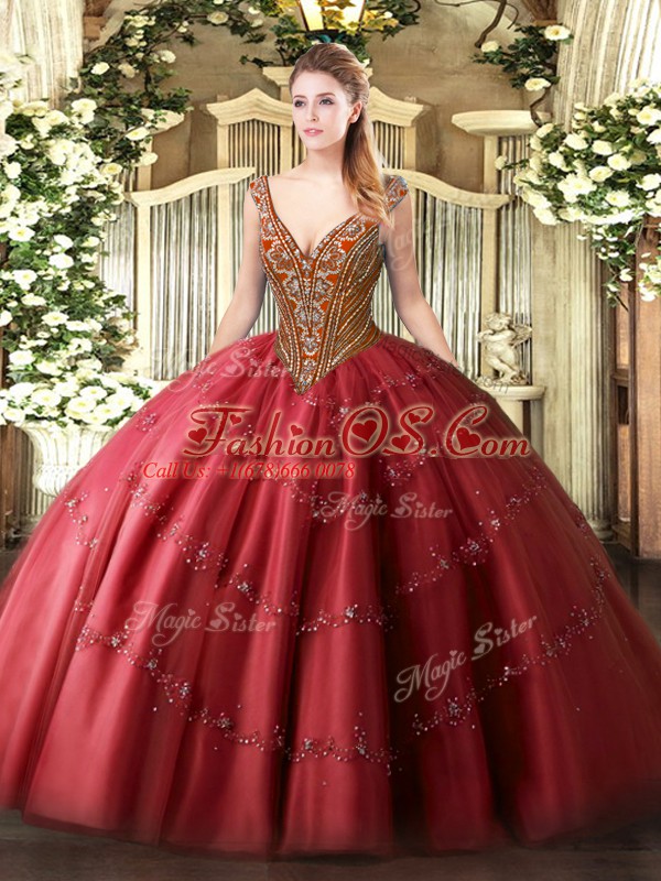 New Style Red Ball Gowns V-neck Sleeveless Tulle Floor Length Lace Up Beading and Appliques Sweet 16 Quinceanera Dress