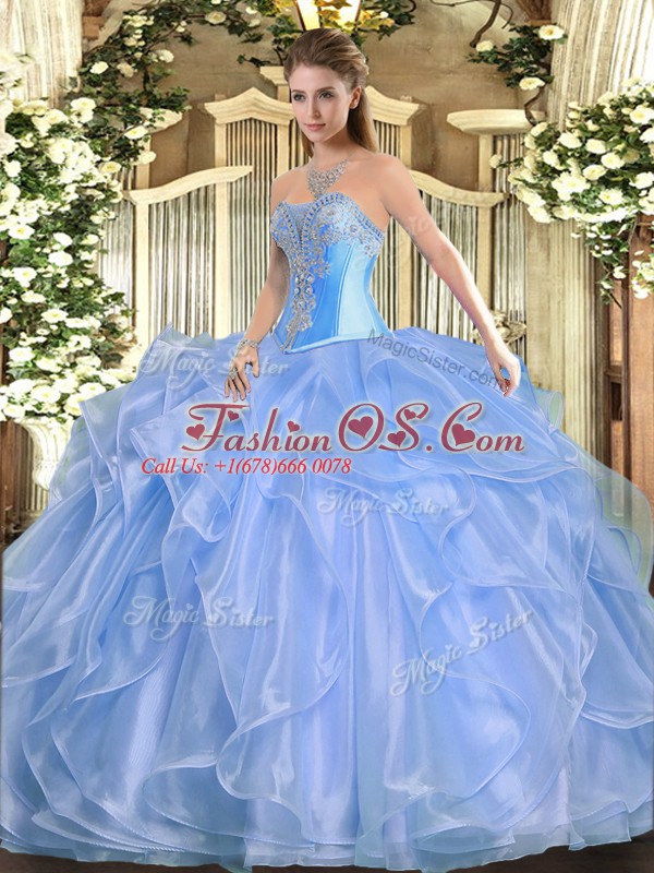 Amazing Floor Length Lace Up Ball Gown Prom Dress Baby Blue for Military Ball and Sweet 16 and Quinceanera with Beading and Ruffles