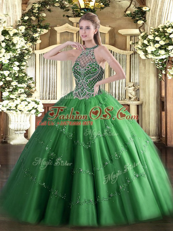 Green Sleeveless Floor Length Beading Lace Up Quinceanera Gown