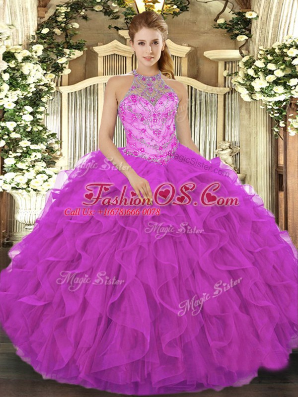 Affordable Fuchsia Organza Lace Up Halter Top Sleeveless Floor Length Quinceanera Gown Beading and Embroidery and Ruffles