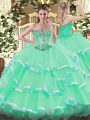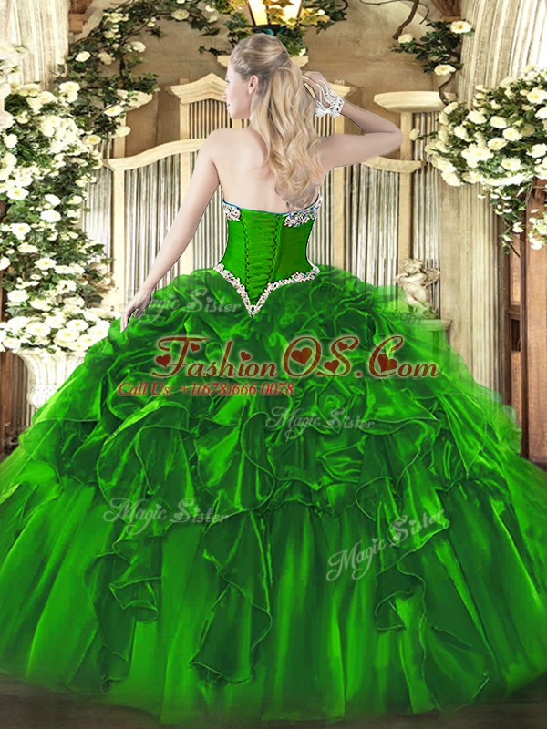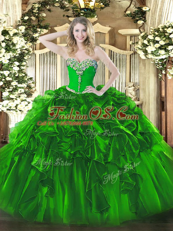 Popular Floor Length Lace Up 15 Quinceanera Dress Green for Military Ball and Sweet 16 and Quinceanera with Beading and Ruffles