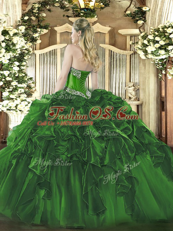 Ideal Floor Length Lace Up Ball Gown Prom Dress Olive Green for Military Ball and Sweet 16 and Quinceanera with Beading and Ruffles