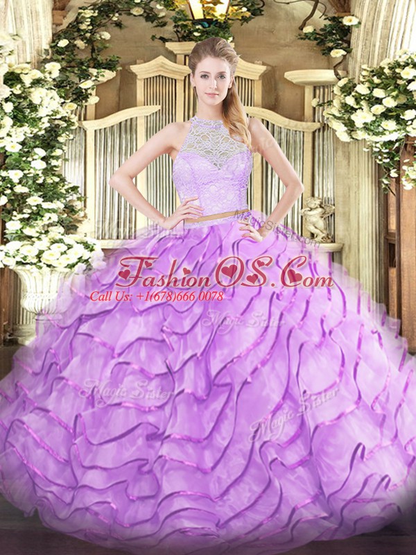 Affordable Lace and Ruffles Vestidos de Quinceanera Lilac Zipper Sleeveless Brush Train