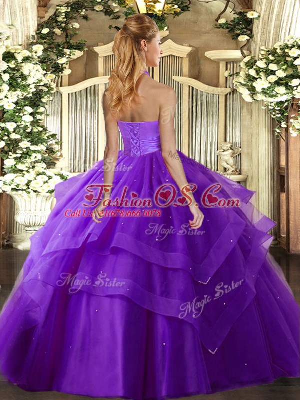 Best Floor Length Lace Up Quinceanera Gown Blue for Military Ball and Sweet 16 and Quinceanera with Ruffled Layers