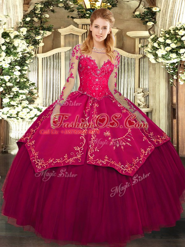 Fancy Wine Red Organza and Taffeta Lace Up Quinceanera Dress Long Sleeves Floor Length Lace and Embroidery