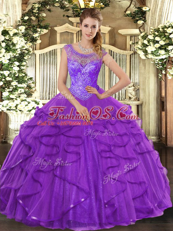 Popular Purple Ball Gowns Tulle Scoop Sleeveless Beading and Ruffles Floor Length Lace Up Sweet 16 Dresses