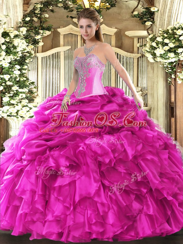 Superior Beading and Ruffles and Pick Ups Quinceanera Dress Hot Pink Lace Up Sleeveless Floor Length