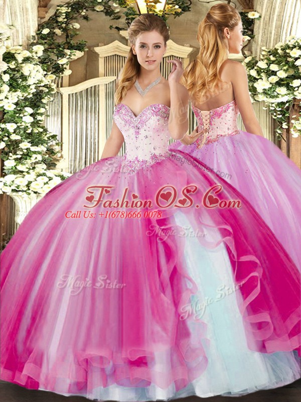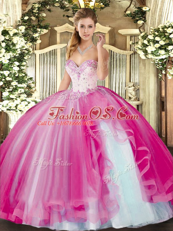 Floor Length Fuchsia Quinceanera Dresses Tulle Sleeveless Beading and Ruffles