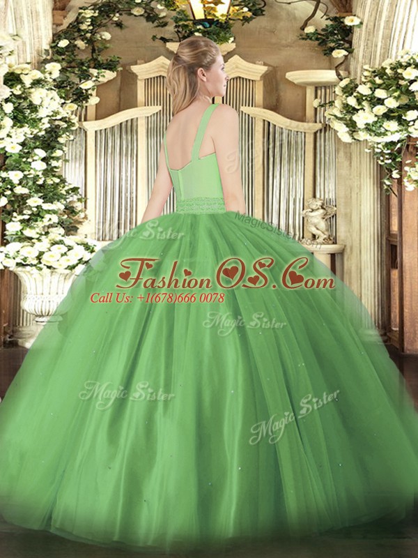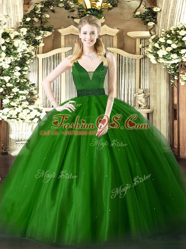 Luxury Green Tulle Zipper Ball Gown Prom Dress Sleeveless Floor Length Beading
