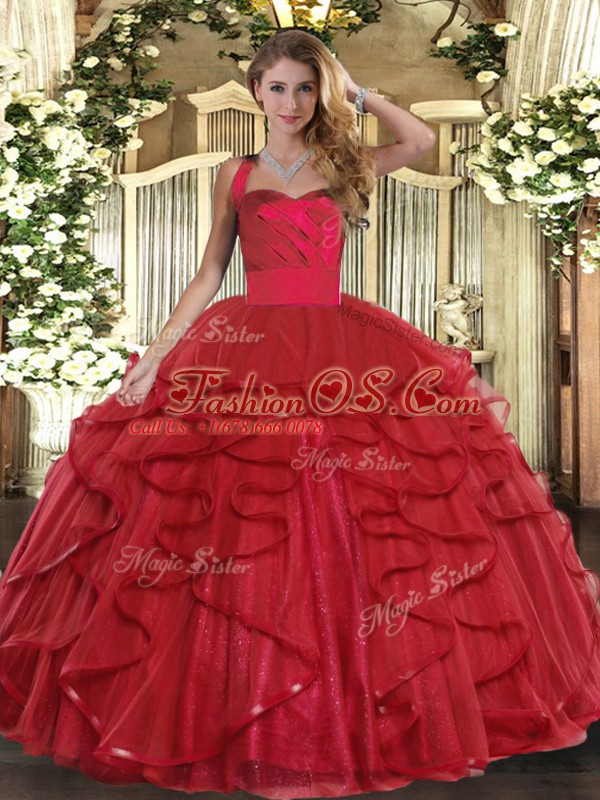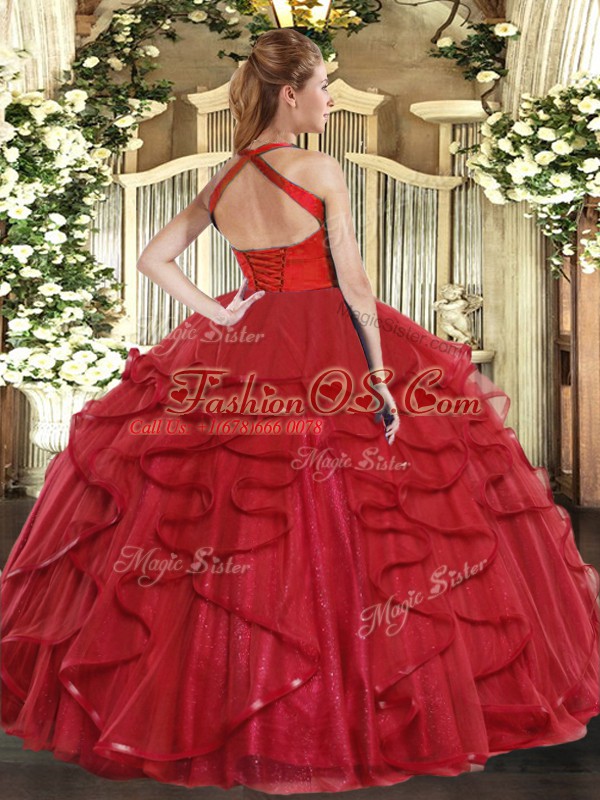 Wine Red Tulle Lace Up Halter Top Sleeveless Floor Length Quince Ball Gowns Ruffles