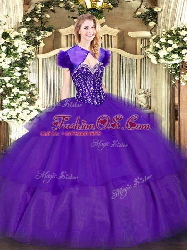 Stylish Sweetheart Sleeveless Quince Ball Gowns Floor Length Ruffled Layers Purple Tulle